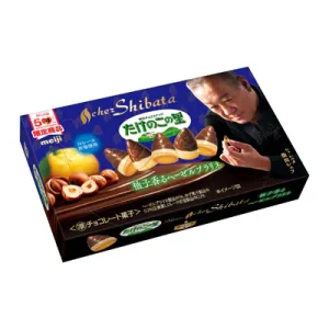 シェ・シバタの柴田シェフと、和をテーマにコラボした商品です。通常のたけのこの里に、ヘーゼルプラリネと柚子のチョコを合わせました。さらに風味豊かなロレーヌ岩塩を使い、クセになる味わいに仕上げています。
